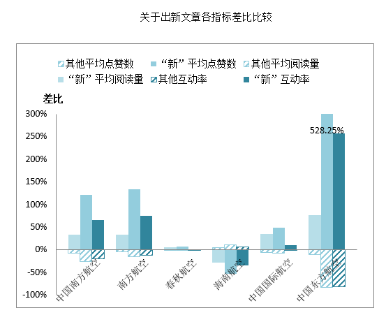 从结果看来,除海南航空外,各航司微信号推出“新”系列文章的平均阅读量和点赞数均高于平均水平。而春秋航空因整体阅读量偏高,此处对比不突出。