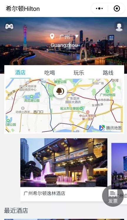在希尔顿小程序中,“吃喝”和“玩乐”版块帮助用户探索酒店周边的美食和景点。“线路”版块为用户提供所在城市的旅游线路规划。