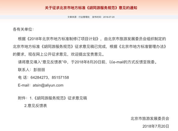 北京市旅游委近日在其官网发布了“关于征求北京市地方标准《胡同游服务规范》意见的通知”,并向社会开展为期一个月的意见征求。该征求意见稿提出,胡同游应有明确的空间边界,边界标记应清晰可见,胡同应设置盲道和无障碍设施,商户卫生间应向游客免费开放使用。