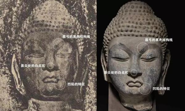 阳新用1720窟现在的照片、关野贞拍摄的照片以及此次苏富比图录上的照片做了大量对比,对比中阳新发现,此次拍卖的佛首石雕头顶上的螺髻数量和排列一致,佛像鼻尖上都有一个白点坑,眉弓处也有几乎相同的黑色结构线。