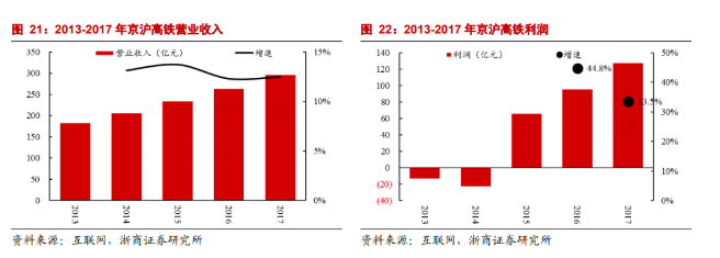 浙商证券研报指出,京沪高铁公司营业收入从2013年的182亿元提升到2017年的296亿元,年均复合增长率近13%,净利润从亏损12.9亿元到盈利127亿元,利润率由负转正至42.9%。