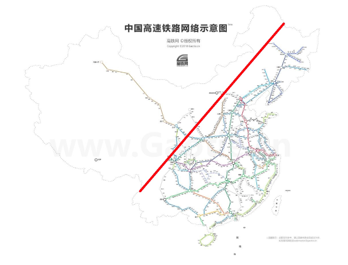 中国高铁线路网络和“黑河—腾冲人口线”示意图,底图来自高铁网