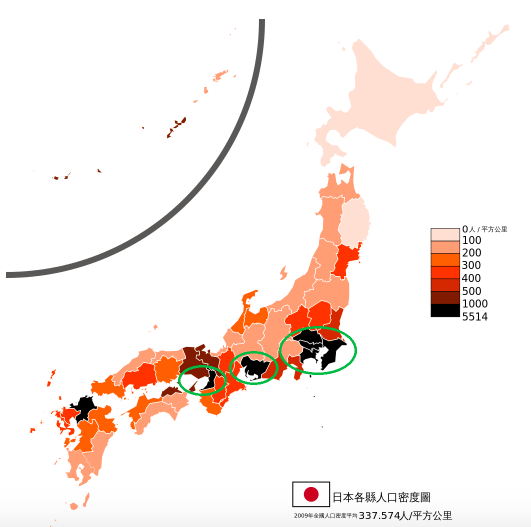图中被圈出的地方从左至右分别为大阪、名古屋和东京都市圈,为日本人口密度最高的三个区域,底图来自维基百科