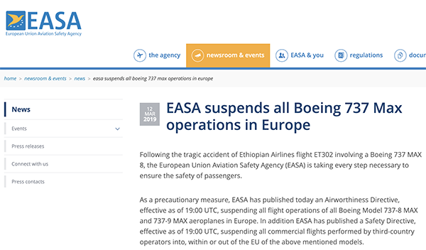 3月12日,欧洲航空安全局(EASA)对波音737 MAX飞机作出适航指令。欧洲航空安全局在其官网发表声明称,在埃塞俄比亚航空ET302涉及波音737 MAX 8的悲剧事故发生后,欧洲航空安全局正在采取一切必要的措施来确保乘客的安全。