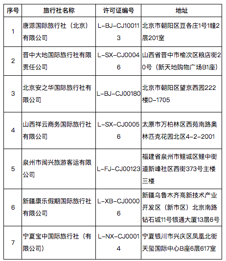 根据《旅行社条例》和《中国公民出国旅游管理办法》,自2019年3月6日起,取消以下7家旅行社的经营出境旅游业务: