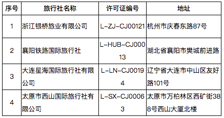 根据《旅行社条例》和《中国公民出国旅游管理办法》,自2019年3月6日起,注销以下4家旅行社的旅行社业务: