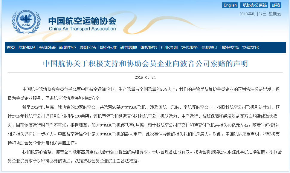 中国航空运输协会网站5月24日发布关于积极支持和协助会员企业向波音公司索赔的声明。