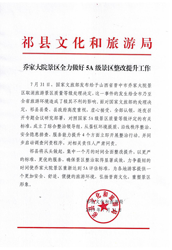 国家文旅部发布给予山西省晋中市乔家大院景区取消旅游景区质量等级处理决定后,祁县文化和旅游局回应:这一事件的发生给全市乃至全省旅游环境造成了极其不利的影响。面对国家文旅部的处理决定,祁县县委、县政府高度重视,虚心接受,全部认领,连夜召开专题会议研究部署,对照国家5A级景区质量等级评定的有关标准,成立了综合整治领导组,从景区环境提质、沿线秩序整治、安全隐患排查、服务能力提升4个方面立即开展整治行动。并同步启动调查问责程序,对相关责任人严肃问责。