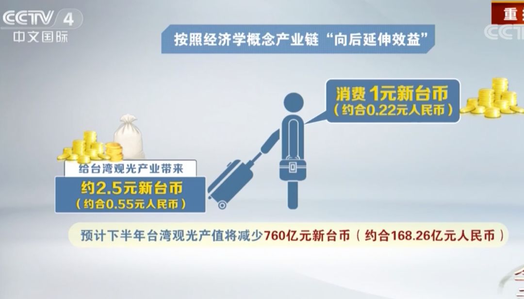 台湾“观光发展协会”副理事长柯牧州估算,近年来陆客来台每人每日平均消费约6200元新台币(约合1372.74元人民币)。若按照经济学概念产业链“向后延伸效益”,每位陆客在台湾消费1元新台币(约合0.22元人民币),就会给整个台湾观光产业带来约2.5元新台币(约合0.55元人民币)的效益。以此计算,预计下半年台湾观光产值将减少760亿元新台币(约合168.26亿元人民币)。