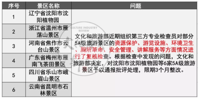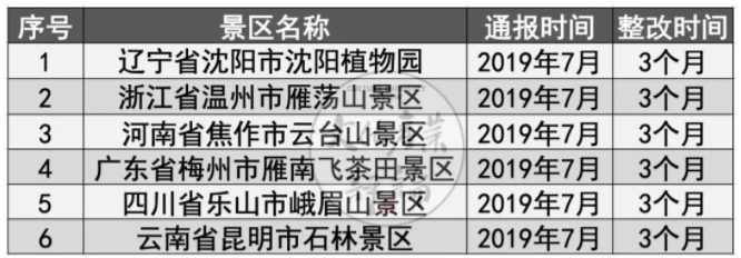 此次,国家文旅部除了给予山西省晋中市乔家大院景区取消旅游景区质量等级处理外,还给予了辽宁省沈阳市沈阳植物园景区、浙江省温州市雁荡山景区、河南省焦作市云台山景区、广东省梅州市雁南飞茶田景区、四川省乐山市峨眉山景区、云南省昆明市石林景区等6家景区通报批评责令整改处理,限期3个月。