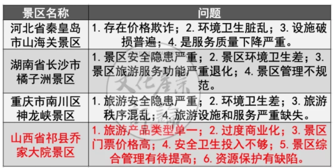 为何如此严重?乔家大院问题出在哪?虽然文旅部的通报并没有给出问题清单,但梳理近来频繁的报道或各平台的文章发现,主要问题有六个方面:1.旅游产品类型单一;2.过度商业化;3.景区门票价格高;4.安全卫生投入不够;5.景区综合管理不规范;6.资源保护有缺陷。