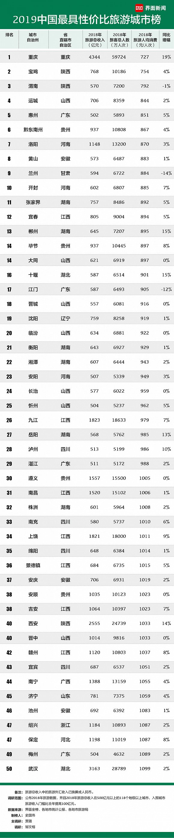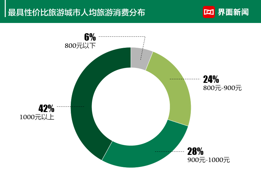数据显示,2018年全年实现旅游总收入5.97万亿元,旅游总人数达到56.80亿人次,全国人均旅游消费1051元人民币,与2017年数据(人均消费1050元)持平;榜单中最具性价比旅游城市人均消费946元人民币低于全国人均消费水平,也印证了上榜城市性价比优势。