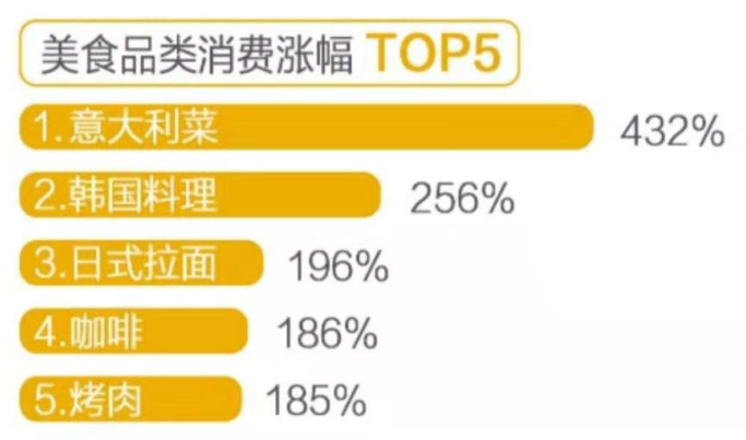 在出境游方面,报告预测,意大利菜将以高达432%的同比涨幅成为境外美食消费品类增速第一名,韩餐、日式拉面、咖啡等紧随其后,涨幅分别为256%、196%和186%,烤肉品类也迎来185%涨幅。而随着境外美食消费大涨,提前订座成境外美食消费新趋势。较平日的订座量相比,日本料理在国庆期间的在线订座量涨幅top5榜中占据三席。