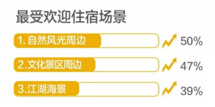 酒店住宿场景或主题中,自然风光类(含农家乐、山景、森林等)涨幅预计超50%,文化类景区周边酒店(含展览、文化馆、艺术表演等)、江湖海景等住宿场景为最受欢迎住宿场景分别将增长47%、39%左右。