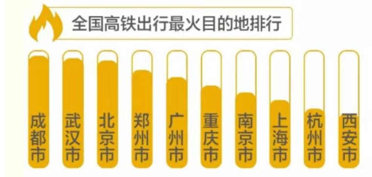 其中,成都、武汉、北京成为国庆期间最受欢迎的高铁出行目的地。郑州、广州、重庆、南京、上海、杭州、西安位列第四到十名。随着2018年渝贵高铁开通,遵义则成为全国高铁票订单量增速最快目的地,也是增速最快的客源地。