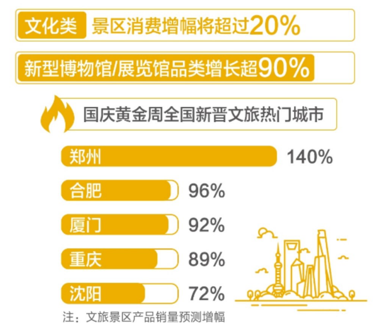 随着文旅不断融合,在“文化过中秋”后,国庆依然将再次迎来文旅热潮。不仅有传统景区,还有新型文化类旅游目的地,共同带动文化旅游热潮持续。报告预测,今年国庆期间,文化类景区消费增幅将超过20%,其中新型博物馆/展览馆品类预计消费规模将再次翻番。