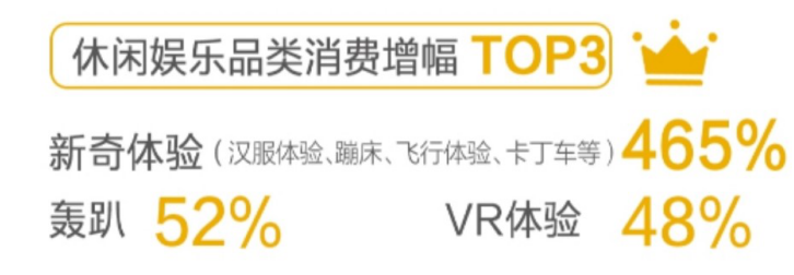 除了景区,到一座城市,当地休闲娱乐项目成为很好的深度体验方式。报告预测,国庆期间,休闲娱乐类消费成为新的爆发点,预计该类消费将增长25%,酒吧、密室和新奇体验(如汉服体验)成为最受异地用户欢迎的品类。