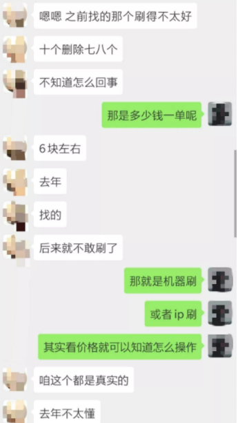 但该人士同时强调,尽管有些平台存在较高删帖风险,但“我们的单子从未被删或封号,因为都是真人操作。”其向记者晒出的对话显示,看价格就能知道操作模式是什么。6元/单的价格肯定是机器刷单,“十个评价里删除七八个”。