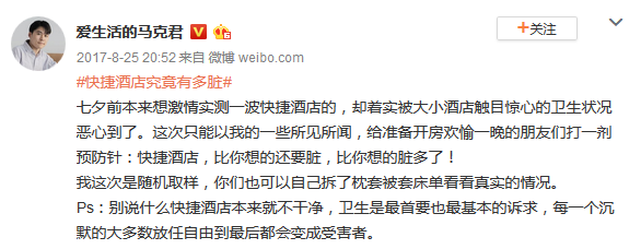 对于经济型酒店屡次出现“卫生门”事件,有网友表达不同观点。比如网友银城武说快捷酒店要求不要太高。