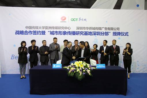 2012年12月18日,深圳市华侨城传媒广告有限公司与中国传媒大学亚洲传媒研究中心战略合作签约,暨“城市形象传播研究基地——深圳分部”授牌仪式在深圳华侨城OCT-LOFT创意产业园隆重举行。这标志着文化整合传播一线公司与城市品牌研究顶级智库的强强联手,双方将在城市文化研究、城市品牌塑造、城市整合传播等领域开展深度合作,推动中国城市文化解读与品牌传播的全新发展。
