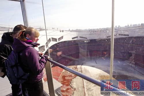 昨天,鸟巢"空中走廊"开放。图为两名外国游客站在60米高的原火炬塔平台,俯瞰钢结构"森林"。