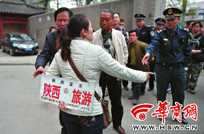 “这有旅游车,来来来,要旅游来这。”昨日上午10时,火车站广场611路调度站附近,一名穿“蓝色制服”的女子手里正拿着“西安—临潼”的牌子大声吆喝。突然,该女子扔下牌子,撒腿就跑。