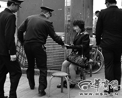 执法人员将一名穿“蓝色制服”的女子手中的旅游宣传单没收 记者张杰 摄