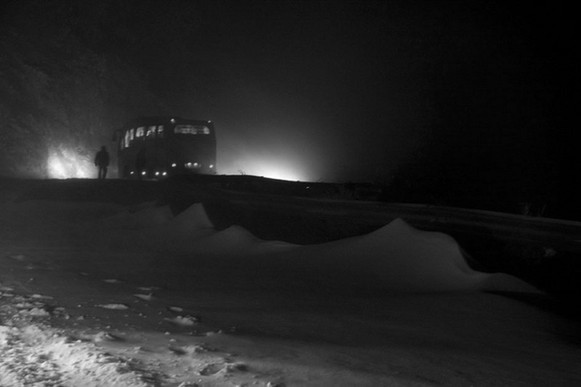 图为:大雪阻路,救援大巴紧急前往接游客安全下山 供图:神农架林区旅游委、周爱华