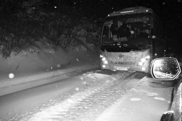 昨晚9时30分许,救援队伍赶到现场后发现,路面积雪厚达40多厘米,他们调集了4台大巴车,并增派铲雪车、防滑链等设备到现场实施救援。