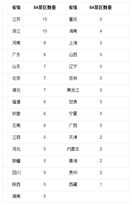 注:此表中不包含:部分联合申报5A级且多景点分别售票的景区(如张家界武陵源—天门山旅游区)、有套票但不强制售卖的景区(如福建省三明市泰宁风景旅游区)。