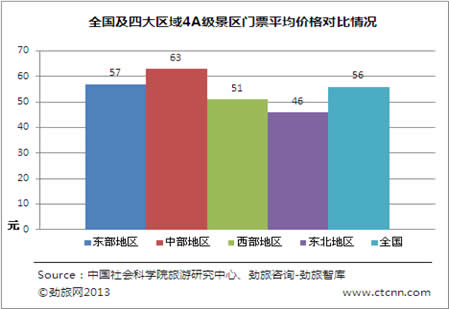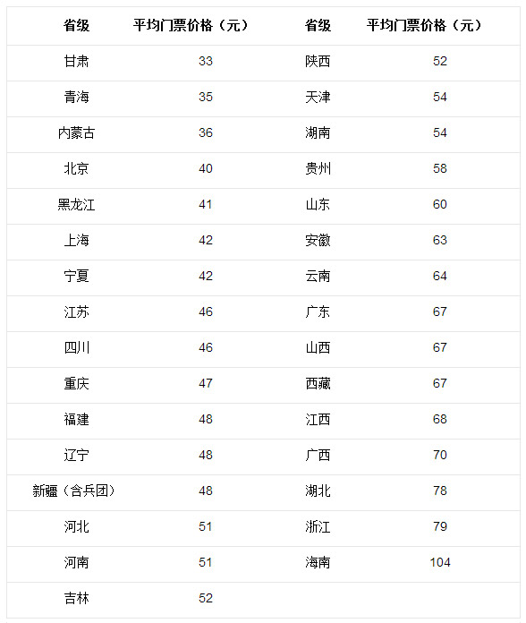 从31个省市自治区来看,4A级景区平均门票价格中,甘肃最低,为33元;海南省最高,为104元;19个省市区的门票价格低于总平均水平56元,12个省市区高于此平均水平。