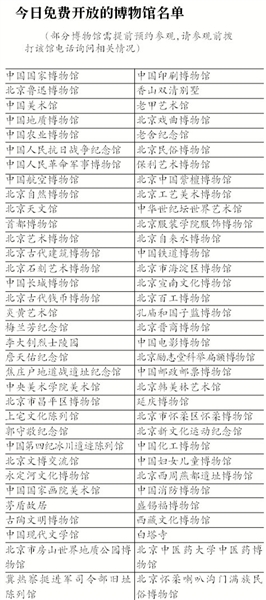 今天是国际博物馆日,北京市文物局昨日表示,今天将有68座博物馆免费对公众开放,其中包括国家博物馆、中国地质博物馆等。同时,故宫博物院、北京天文馆、周口店北京人遗址博物馆、中国地质博物馆等还赠送出5000张参观门票。