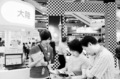 5月25日至27日,台北举办国际观光博览会,博览会设立“两岸观光区”,大陆多省市组团赴会吸引游客。但观光区外,台湾各大旅行社也都打出“大陆”招牌。图为台湾旅行社工作人员推销大陆游路线。