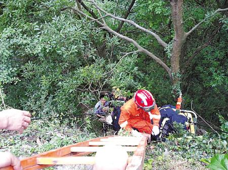 当地民警、消防队员、医护人员先后赶到,救援人员首先对受伤者进行了创口处理。最初大家决定依托山涧两侧两棵大树作为支点,选择50米通用安全绳作为横渡的路径,利用折叠式担架将伤员固定,再利用20米安全绳由上方消防队员予以绳索牵引,先将被困者移至山涧上方平台,展开两段式救援。然而,由于山崖落差过大,这一救援不得不中断。现场调集了不少救援人员,大家最终设法从山崖另一端开辟救生通道,利用“蚂蚁搬家”的战术,消防队员、民警和伤者家属等十余人,跪爬扛顶拉,交替缓慢地将担架抬至路边护栏下方。将伤员运送至距离路面四五米处时,由消防队员利用六米拉梯及救援绳索,在民警、家属等配合下水平地将担架向上拉至路面。经过近一小时的救援,伤者被成功救出。