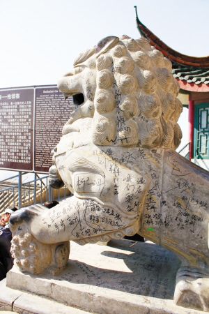 抱犊寨景区宣传科科长康永恒说,南天门门口的两个“镇山之宝”石狮子,曾经全身甚至舌头上都被碳素笔乱涂乱画满了。碳素笔油渗入到石头里,根本就擦不掉,后来他们聘请了相关专家,硬是用强酸给狮子脱掉了一层石头皮,才算将石狮子清理干净。而最让人无奈的是景区的城墙砖,有的游客用刀子等硬物把字迹刻到了城墙砖上,这样的涂鸦是无法处理的。