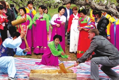 端午节是吉林省延边朝鲜族人民隆重的节日。这一天最有代表性的食品是清香的打糕。打糕,就是将艾蒿与糯米饭,放置于独木凿成的大木槽里,用长柄木棰打制而成的米糕。这种食品很有民族特色,又可增添节日的气氛。