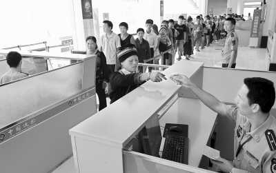 6月15日,中越边民及出入境旅客在天保口岸边检大厅办理手续。据统计,2013年1月至6月15日,位于云南省文山壮族苗族自治州麻栗坡县中越边境的天保口岸出入境旅客31.5万人次,进出口客、货车1.58万余辆,分别较去年同期增长99%和69%。