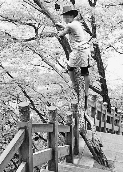 6月10日是端午小长假的第一天。当日,雨后初晴的国家5A级风景区——河南省修武县云台山风景区,吸引了来自省内外的众多游客。然而,部分游客在饱览山水风光的同时,做出了不按照景区提示牌线路游览、攀爬树木等不文明行为,不仅大煞风景,也存在一定的安全隐患(见图)。希望游客提高自身素质,文明旅游,同时也希望景区加强管理。