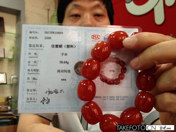 5月31日,杨先生等人高高兴兴地回到北京。做事比较谨慎的杨先生,带着从南非带回的蜜蜡饰品,去了一趟北大宝石鉴定中心,结果让他大吃一惊。鉴定师说:“这手镯、手链都是假的,不是蜜蜡,是塑料。”杨先生非常失望,又问了一句:“那这东西能值多少钱啊?”鉴定师没直接回答,只说:“塑料的,和家里的塑料盆一样的东西,你说能值多少钱啊?”杨先生拿着东西低头出门。