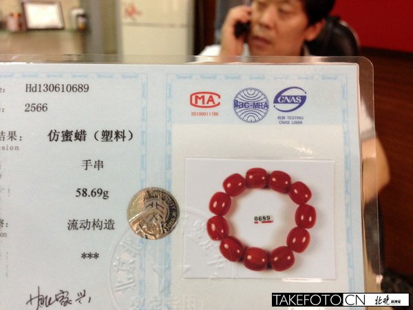 杨先生手拿标有“仿蜜蜡(塑料)”字样的鉴定证书。