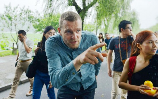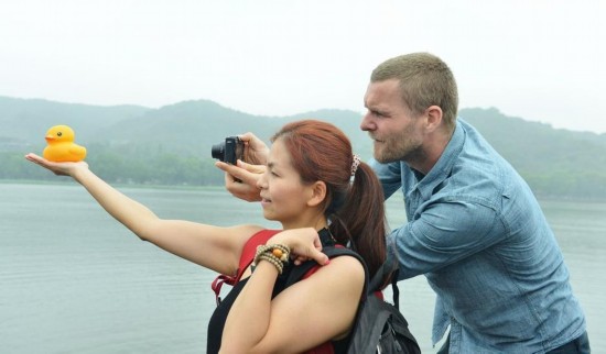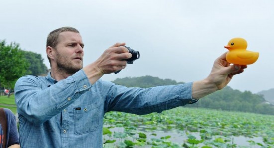 2013年6月26日,浙江省杭州市,“大黄鸭”之父弗洛伦泰因·霍夫曼在白堤上为“大黄鸭”落户杭州西湖选择观赏点。