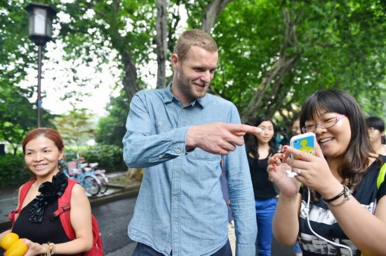 2013年6月26日,浙江省杭州市,“大黄鸭”之父弗洛伦泰因·霍夫曼在白堤与游客聊天互动。