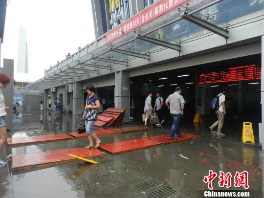 “水已经退了不少,最深的时候漫到小腿肚了”,一位现场排水的环卫工说。出入旅客纷纷脱鞋或直接涉水而过。