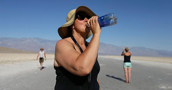 美国部分地区正遭受着几十年不遇的高温天气。美国死谷国家公园(世界最干旱的地区之一)的温度达到130华氏度 (54℃),仅略低于一个世纪以前在此地测得的历史最高温134F(56.7℃)。在广受游客青睐的拉斯维加斯,气温有望些许降低,但是犹他州大部分地区仍保持113华氏度(45℃)的高温,国家气象局已发布了高温警报。