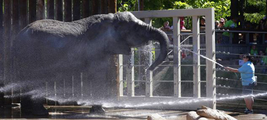 洒水降温:盐湖城动物园接收到高温预警后给动物们洒水防暑。