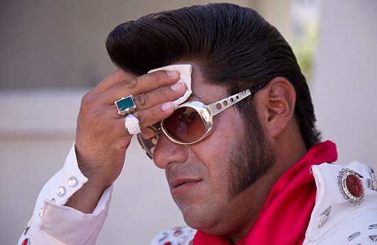 炽热国王:"猫王"埃尔维斯•普雷斯利的模仿者克里斯蒂安·莫拉莱斯在拉斯维加斯大道热得直抹汗。