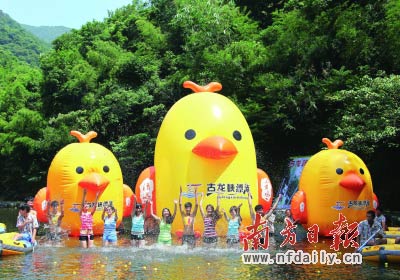 活动当天,清远古龙峡漂流景区人声鼎沸,来自全国各地的游客“全副武装”前来,他们不仅能先睹世界最大卡通鸡的真容,而且将参与“全城捞鸡”的狂欢盛宴。随着市委宣传部副部长、文明办主任马家庆宣布世界最大的动漫清远鸡暨漂流召集活动启动仪式开始后,3只巨型清远卡通鸡出现在古龙峡漂流河道的终点上,缓缓向岸边的游客“游”来,引得现场游客欢呼不止,纷纷上前合影留念(见右图,梁素雅摄)。