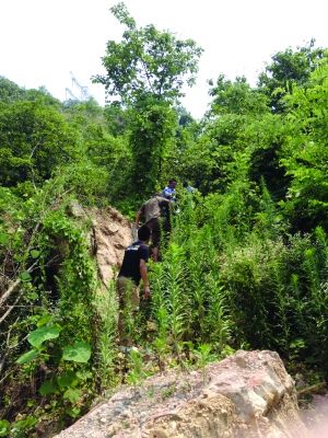 虽然五峰山不是很高,但是现代快报记者昨天在寻人过程中发现,要爬到山顶非常不容易,这里地形复杂,到处是悬崖峭壁。夏天,山上杂草丛生,带刺的植物长势尤为茂盛。这也给搜救工作带来了巨大的阻碍,一些搜救设备都没能用得上。