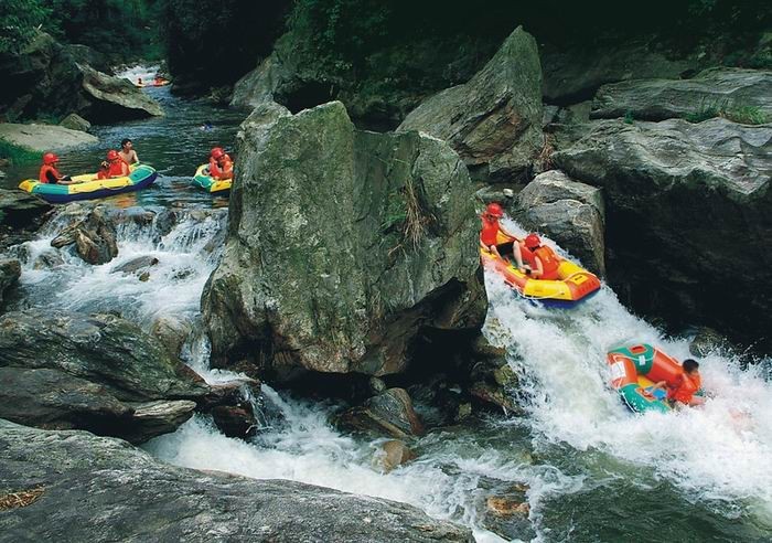建德的AAAA风景区“七里扬帆”,有“小三峡”美誉,是与长江三峡、桂林漓江齐名的亲水游胜地,是《富春山居图》实景再现之地。游客泛舟江面,江水平缓明澈,两岸翠山如屏,江风拂面,舒爽怡人。船经葫芦峡,游客可以下船到葫芦峡的溪谷中玩皮筏艇漂流。葫芦峡漂流连续两次在长三角漂流大赛中荣获“最佳漂流”称号。因它地处富春江国家森林公园之中,森林覆盖率达90%以上,又被誉称为“浙江生态第一漂”。漂流全程约3公里,落差近100米,十分刺激凉爽。坐皮筏艇顺流而下,时而“激流勇进”,时而“一波三折”,游客可在水花四溅中尽享“透心凉”的戏水之乐。