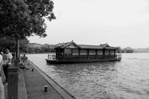 画舫船从一公园码头出发,逐渐驶向三潭印月。就在接近三潭印月的时候,二姐为了拍照,迅速翻过围栏爬上了船尾,结果不小心掉了下去。